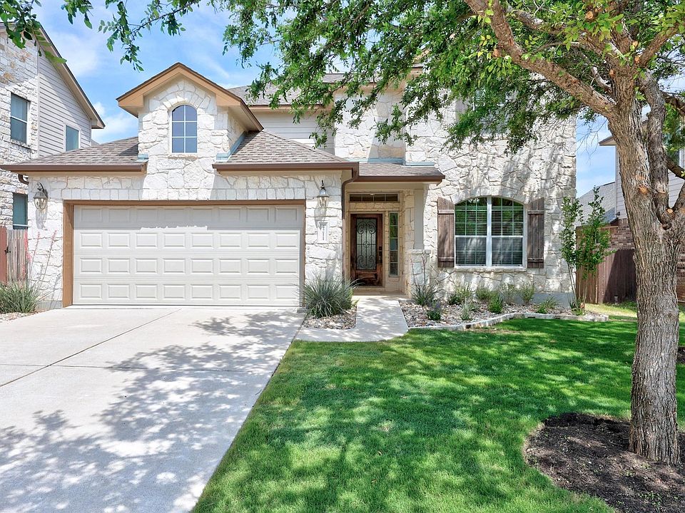 NEW PRICE! (30 year dimensional shingle roof installed May 2025) Step into this beautifully updated, light-filled home and prepare to be impressed. Gleaming hardwood floors and plush carpet throughout (2025), soaring ceilings, and a stunning floor-to-ceiling stone fireplace make a striking first impression. Bathed in natural light from abundant windows, the open-concept living room flows effortlessly into a sunlit breakfast nook and dream kitchen—expansive granite countertops, stainless appliances (including a newer refrigerator), a large bar for casual dining, and a generous amount of cabinetry that extends into a butler’s pantry connecting the formal dining room. ***With 5 bedrooms and 4 full baths and an office, this home offers flexibility for any lifestyle. Downstairs, the spacious primary suite features a spa-like bath with soaking tub, walk-in shower, double vanities, and a walk-in closet. A second downstairs bedroom and full bath steps away make an ideal guest suite.***Upstairs, the soft new carpet welcomes you to three additional bedrooms—including one with its own private full bath—plus a versatile media room or casual living area that overlooks the grand living space below.***The freshly landscaped front yard with new rock beds of native Texas plants. The young Crepe Myrtle promises years of beauty against the home’s Austin stone exterior. New sod has been added and a decomposed granite path leads to the backyard, where you’ll find another charming rock garden beside the garage. ***Located in the highly desirable Ranch at Brushy Creek and zoned to acclaimed Round Rock ISD schools, this home is minutes from major employers & shopping and is surrounded by family-friendly amenities. Explore the nearby 90-acre Brushy Creek Lake Park with nature trails, kayaking, fishing, dog pond and more —or enjoy the community pool just blocks away.