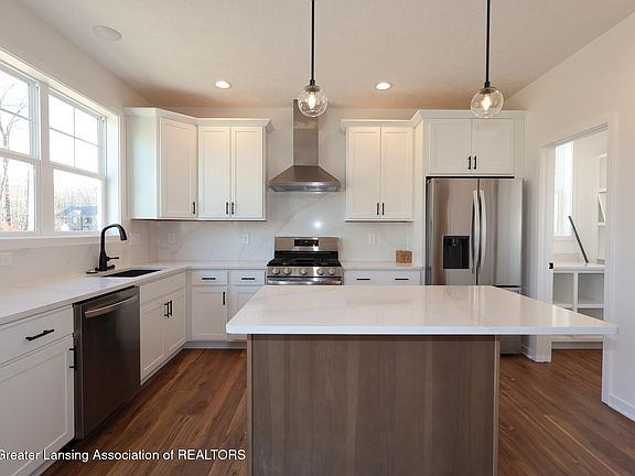 This beautifully designed 5-bedroom, 3.5-bath, 3-car garage Energy Star Certified home offers the perfect blend of comfort, craftsmanship, and modern convenience. The main floor features a private flex room with elegant double French doors, ideal for a home office or den. Enjoy open-concept living in the spacious Great Room, complete with a gas fireplace flanked by built-in bookshelves. The stylish kitchen opens to a sunlit café area, with sliding doors leading to a vinyl deck, perfect for entertaining. A convenient half bath and mudroom complete the first floor. Upstairs, you'll find three secondary bedrooms, a full bath, second-floor laundry room with folding counter, and a luxurious Primary Suite boasting a massive walk-in closet, dual vanities, private water closet, and a ceramic tile shower. Downstairs, enjoy over 700 sq. ft. of finished space in the basement, including a spacious rec room, 5th bedroom, and third full bath that is ideal for guests, hobbies, or movie nights. Located in the heart of Grand Ledge, this home delivers energy efficiency, thoughtful design, and flexible living space all in a welcoming community.