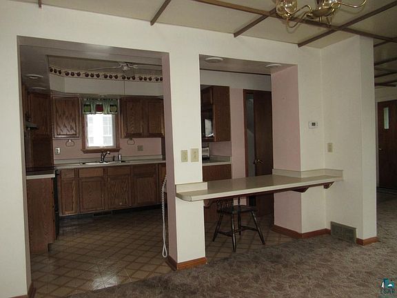- Description: Kitchen with oak cabinets, linoleum flooring, stove, refrigerator and dishwasher. There is a breakfast bar.