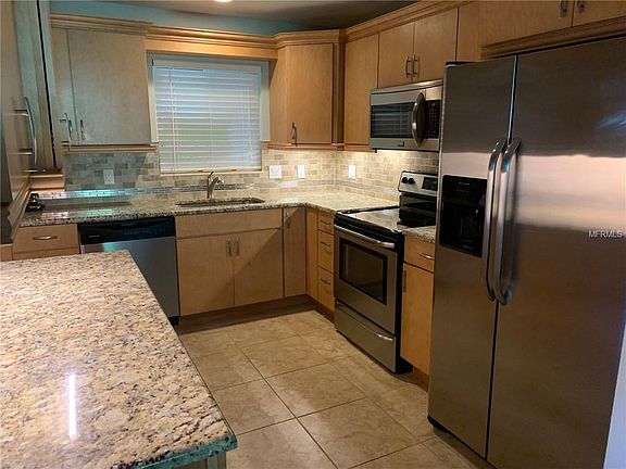 You've found your retirement home! Quiet top floor end unit in a 55+ community was remodeled in 2015 with a new kitchen featuring granite counter tops, solid wood cabinets with 2 pull out trash bins, new Frigidaire stainless steel appliances and new porcelain tile floor. There is new laminate flooring in the living room, dining room and bonus room. The bonus room has a full size closet and can be used as an extra bedroom or a home office. Both bathrooms have new vanities, medicine cabinets, sinks, toilets and new porcelain tile floors. As an end unit, it is larger than the interior units and has windows on 3 sides and features 9 all new impact resistant, high R windows. A new electric panel and new hot water heater were installed in the past 3 years. The unit comes furnished and is ready to move in.