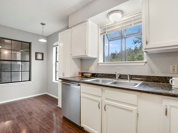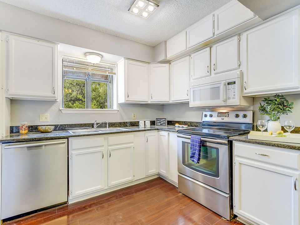 Bright, open and recently updated 3 bed condo in the medical center. The third room can easily be used as an office. Conveniently located near I-10 and 410, USAA. Recently painted, you'll love the wood burning fireplace, and spacious back patio with roller shades perfect for an evening relaxing above the tree filled common spaces. Community pool is within view of the back of the unit. Granite counters in the kitchen. Lovely home in gated community.
