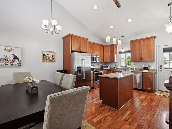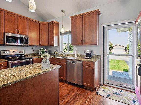 Welcome to this stunning, move-in ready townhome! As you step through the front door, you'll be greeted by soaring vaulted ceilings that seamlessly connect the kitchen and dining area to the inviting family room, creating an airy open-concept space perfect for everyday living. The kitchen features warm maple cabinetry, granite countertops, and stainless steel appliances, complemented by island seating and a cozy dining area. Relax in the family room by the gas fireplace, or step outside to the backyard patio for some fresh air or grilling. On the main floor, you'll find a versatile bedroom, a convenient 3/4 bath, and a laundry room with ample storage. Upstairs, two spacious bedrooms each come with their own private full bathrooms, offering comfort and privacy. With a functional layout, plenty of storage, and a desirable cul-de-sac location near a park, this townhome is a perfect blend of style and convenience.