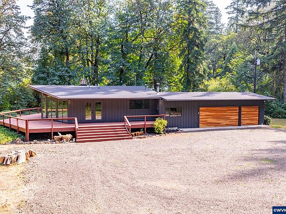 Discover serene living on over 5 acres with beautiful Crabtree Creek frontage. This 3 bed, 2 bath home offers a peaceful and private setting surrounded by nature. Thoughtfully updated while preserving its original charm, it features warm wood accents, a cozy brick-surround fireplace, and large windows that fill the home with natural light. Relax on the expansive wraparound deck and enjoy the tranquil views. Many recent improvements make this secluded retreat move-in ready. Updates include: • Roof• Complete HVAC system; electric forced air furnace and AC• LVP Flooring• All new drywall to replace wood paneling• Appliances• Toilets• Shower• All Countertops now Quartz with new hardware• New double front doors• Door hardware and deadbolts throughout• All Interior and exterior lighting• All interior and exterior plugs and switches, GFI added in kitchen, bathrooms and outside• New glass in huge panel window• All New Bedroom Windows• Interior and Exterior Paint• New teak Garage Doors with openers• Completely rebuilt and painted 1000sq/ ft deck and stairs with cable rails• 7 stumps removed and leveled yard