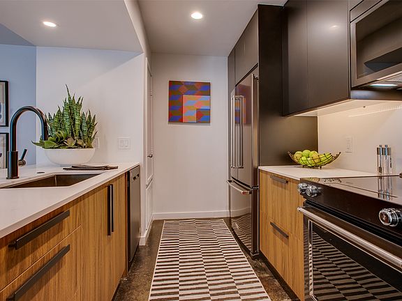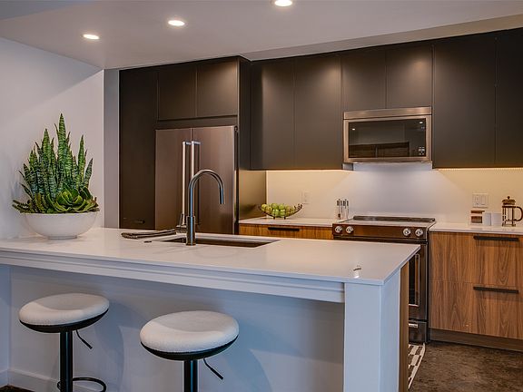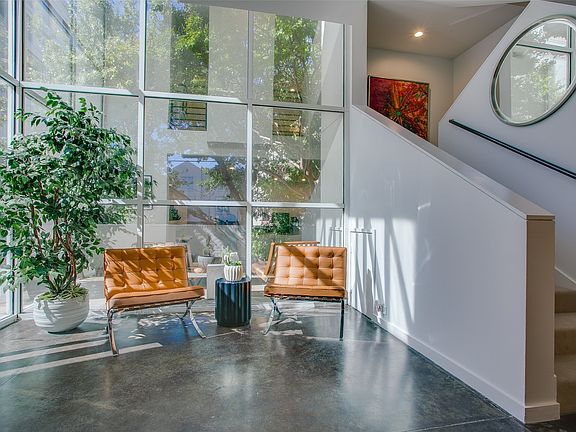 Totally re designed Ron Womack modern urban sanctuary one of a kind in the Parkwood Summit that rarely come for sale. Front unit only one with three outside separate spaces. Completely remodeled. Kitchen with new cabinets and counter tops with Kitchen Aid architect series appliances. Replaced lighting throughout with dimmers. Master bedroom suite has extended fireplace wall with access for TV. Complete new bathroom with all extras including outlets in the drawers. Custom Elfa closet with loads of storage and a washer and dryer utility closet. Wood floor upstairs and stained concrete floors down Custom blinds with black out in the bedroom.. Wonderful roof top terrace for privacy. HOA includes gas water trash and insurance. Small eight unit complex One off a kind unit in this development. This home has it all plus its directly facing the Katy Trail and all the restaurants and shops of the Terminal.