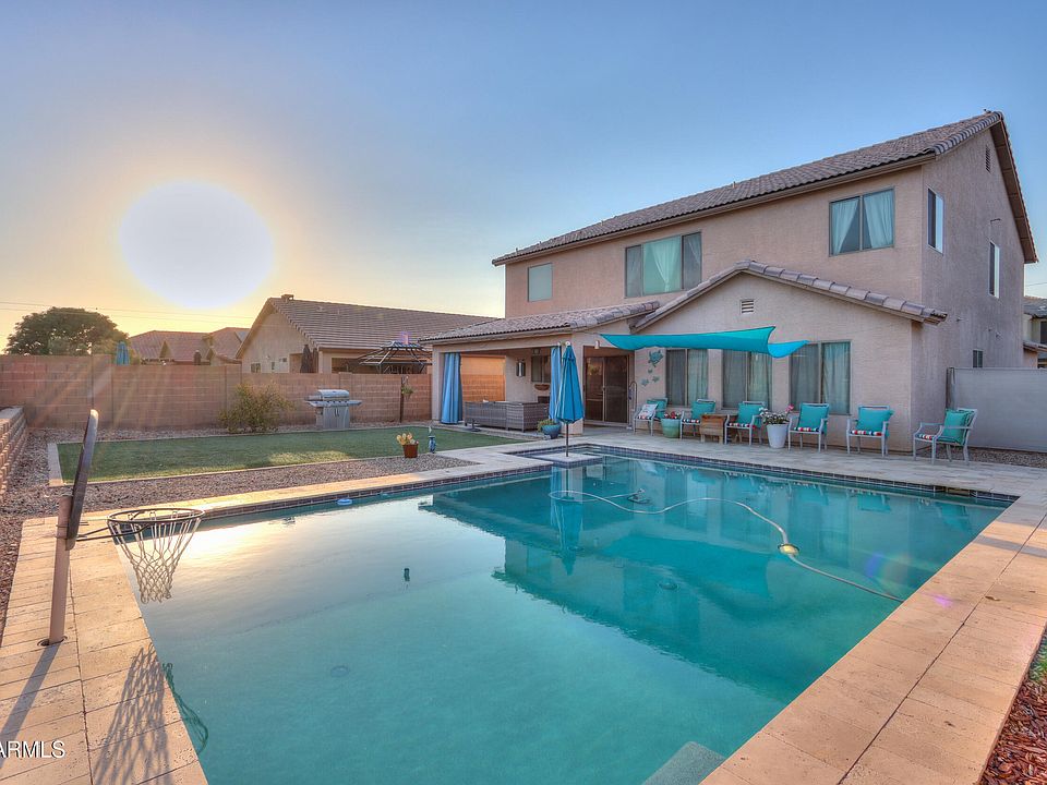 Motivated Sellers. Welcome to this spacious, nearly 3,000 sq' home in the heart of Maricopa! Offering 6 bedrooms and 3 bathrooms, including a convenient main-level bedroom—perfect for guests or multigenerational living. Large theater/family room. The open-concept kitchen features Silestone countertops, a huge walk-in pantry that turns a corner, ideal for entertaining. Enjoy hot summer days in the sparkling 18x28 pool complete with a built-in bench and table. Energy efficiency is top of mind with extra insulation and TechShield. Two community pools, close and heated. Located near Pacana Park, you'll have quick access to recreation such as Pickleball, Fishing, Basketball, Tennis, Outdoor gym equipment, and a Large playground. This home truly has space, comfort, and convenience all in one.