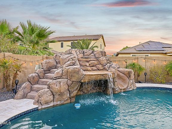You must see Maricopa's favorite floor plan before it sells! This gorgeous 5-bedroom, 3.5-bath home is a true multi-generational (Next Gen) home, perfect for extended families, guests, or rental income (could bring in $1500/month). The additional 800 sq ft suite offers a private entrance, family room area, kitchenette, sink, dishwasher, separate bedroom, walk-in closet, washer/dryer, and full bathroom! The heated pool is simply amazing, with UPGRADED travertine decking and a grotto, waterfall, slide, and spa!