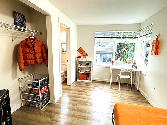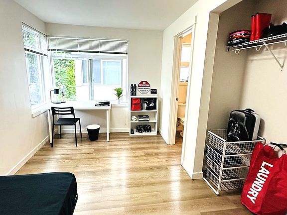 Radian Apartments offers 4 private single rooms each with their own PRIVATE BATHROOM. Each private suite is fully furnished with a bed, desk, bookshelf and 3 drawer dresser. Residents share a common area that offers a full-size kitchen, a dining set and an in-unit smart washer/dryer.
