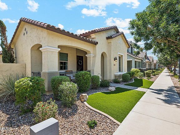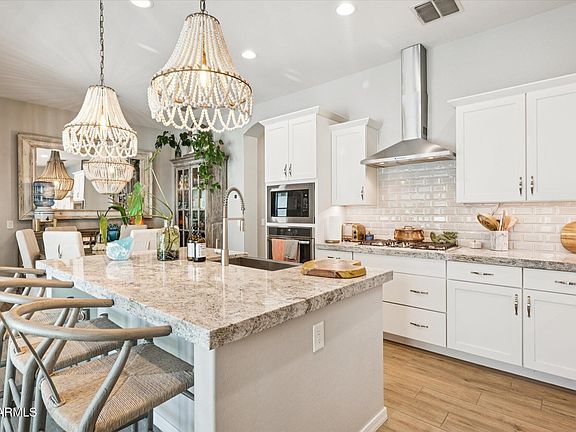 Step into the chef-inspired kitchen, showcasing a large center island, white shaker cabinetry, granite countertops, stainless steel GE appliances, a 5-burner gas cooktop, walk-in pantry, & both a breakfast bar & eat-in dining area. Enjoy the privacy of a split floor plan, with a spacious primary suite featuring dual vanities, a soaking tub, & a spa-like shower with a built-in seat. Soaring 10-foot ceilings & elegant plank tile flooring elevate the interior, while a 4-panel multi-slide glass door connects the kitchen/great room to a serene, low-maintenance backyard. outdoors, relax or entertain on the covered patio complete with pavers, artificial turf, and a cozy gas fireplace perfect for BBQs or quiet evenings under the stars. Spacious 2-car garage with overhead storage racks and built-in cabinetry. Large laundry room with upper/lower cabinets, countertop workspace, and pre-plumbed for a utility sink. Energy-efficient features and modern finishes throughout. Residents of Cooley Station enjoy access to the aquatic center, featuring basketball courts, a community pool, BBQ areas, & multiple parks & play spaces. Conveniently located near top-rated schools, shopping, dining, & just minutes from the Loop 202 Freeway, this home combines comfort, convenience, and community.