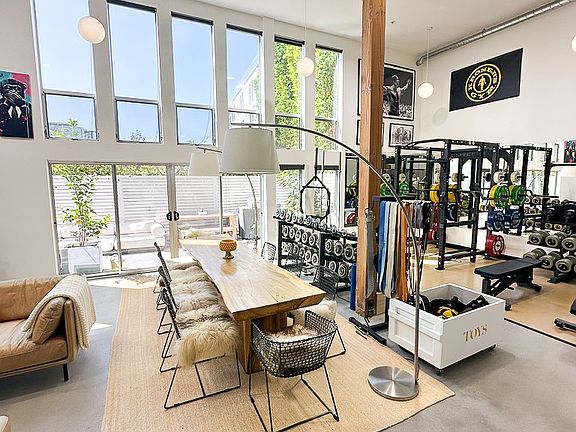 Discover refined urban living in this 2,135 sqft two-story live-work first floor unit at WestEnd Lofts! Designed for professionals or creatives with discerning tastes, this sophisticated residence offers a seamless blend of style and versatility. Flooded with natural light through 17-foot floor-to-ceiling windows, the open industrial-style layout features matte concrete floors, stadium-style lighting, and glass mirrors ideal for a home gym, yoga or pilates studio, or creative workspace/studio. The sleek kitchen boasts stainless steel appliances, modern cabinetry, ample storage, and a built-in reverse osmosis system. Step outside to your private 400 sqft patio, a serene spot for relaxation. The upstairs master suite includes a spacious walk-in closet, a private office area, and an en-suite bathroom. The main-level second bedroom, versatile as an office or media room, is adjacent to a full bathroom. Both bed rooms feature smart blackout shades. New LG washer and dryer for your convenience.
