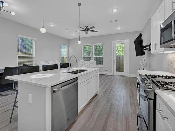 Discover this sleek, contemporary 3-bedroom, 2.5-bath home built in 2022, nestled just 4 miles from Downtown Houston. With 1,770?sq?ft of well-appointed living space, this open-concept layout is ideal for modern entertaining and comfortable family living. The gourmet kitchen showcases stainless steel appliances, custom cabinets with soft-close features, quartz countertops, and a modern backsplash a stylish centerpiece for the home. An adjacent bonus room offers flexible space for a media lounge, home office, or playroom. The upper-level primary suite includes a luxurious en-suite bathroom with a soaking tub, separate shower, dual vanities, and walk-in closet. Two additional generously sized bedrooms share a well-designed full bathroom upstairs, complemented by a convenient half bath on the first floor.