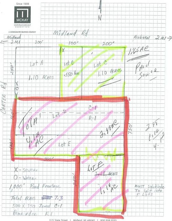 4.12 acres with home that draws $600/month income. City water, sewer available at the road. Located just S. of Midland Rd. on the E. side. Great Tri-city location. Lots D & E & F.