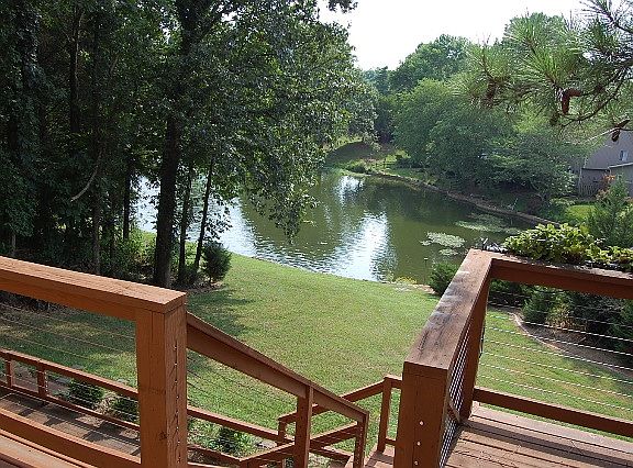 Welcome Home! Spectacular Views of the 4th Green and Pond. Abundance of Natural Light. Newer wood floors through out Kitchen, Dining Room, Great Room, Hallway and Master Bedroom. Spacious Great Room with cathedral ceilings. Master Bedroom Suite with walk in closet and steam shower. Second bedroom and laundry on the main. Den/ Office overlooking pond with fireplace. Upstairs boasts 2 large bedrooms, bathroom, and a loft that would be great for additional storage or hideaway. Walk out basement to patio that could be used as a separate living area with full bath, fireplace, and kitchenette. Screened Porch off Kitchen and expansive deck along the back. Premium Lot.