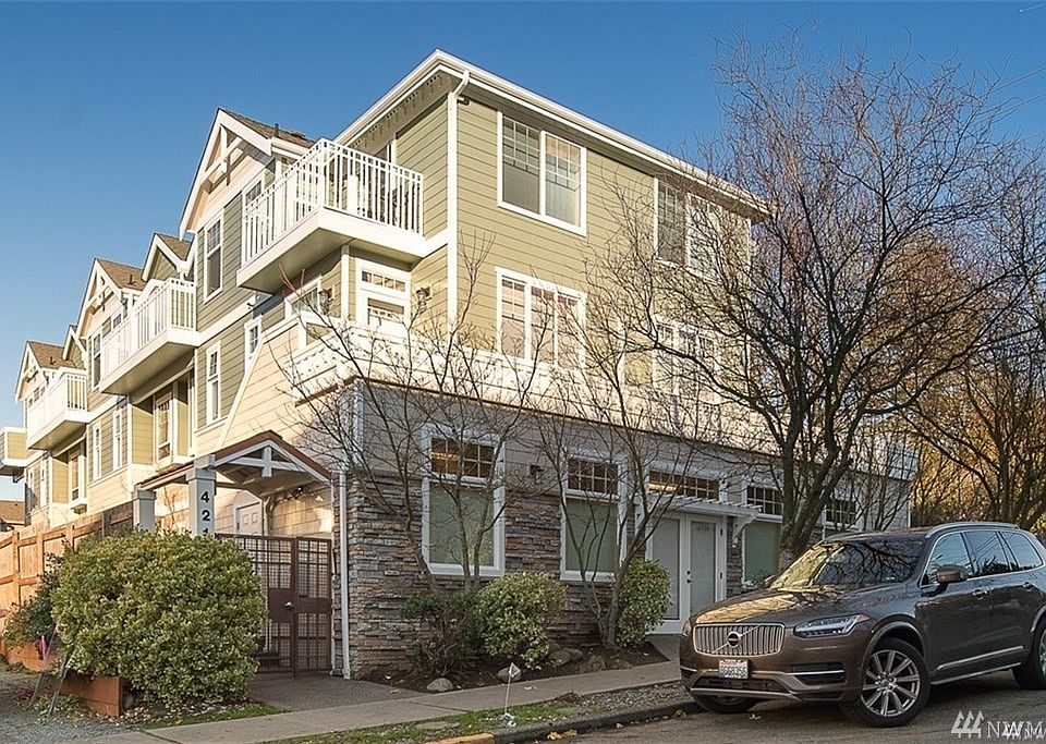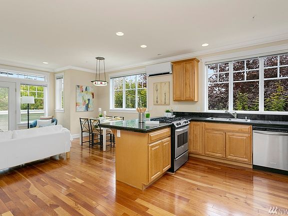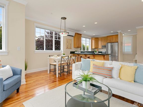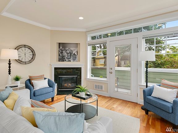 Top floor SW corner end unit in boutique townhome complex of 6 units. PERFECT home to work remotely. Larger of 2 BDR's offers a view deck, room for outdoor table & chairs, walk-in closet & sep office/tech space. BRIGHT open floor plan, huge kitchen, granite counters, space for 4 bar stools, tall ceilings. Sep dining area. Gas fireplace & A/C! 2 Deck off living room can accommodate lots of outdoor furniture. Lots of storage. Full size W/D. Blocks to restaurants, grocery, parks etc. 1 car garage.