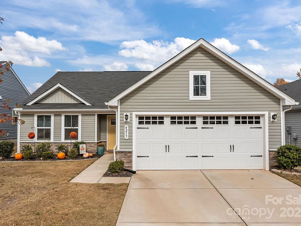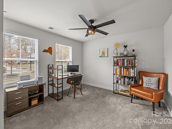 Stunning 3-Bedroom Home with High-End Finishes! Step into this beautifully designed 3-bedroom, 2-bath home featuring top-tier upgrades and an open-concept layout. The spacious living room flows seamlessly into the kitchen, complete with modern cabinetry, a large island, elegant quartz countertops, and a stylish backsplash — perfect for everyday living and entertaining. A versatile office or flex space adds functionality, while the generous primary suite features a custom-designed closet by Closets by Design. The second bedroom is bright and comfortable — ideal for guests, family, or a stylish home retreat — paired with a well-appointed second bath for added convenience. Ceiling fans enhance comfort throughout every room. Outdoors, enjoy a serene water and wooded view from the extended patio, partially fenced backyard with a retaining wall — perfect for gatherings or quiet evenings. Located just minutes from I-485, dining, and shopping, this home perfectly blends luxury, comfort, and convenience.