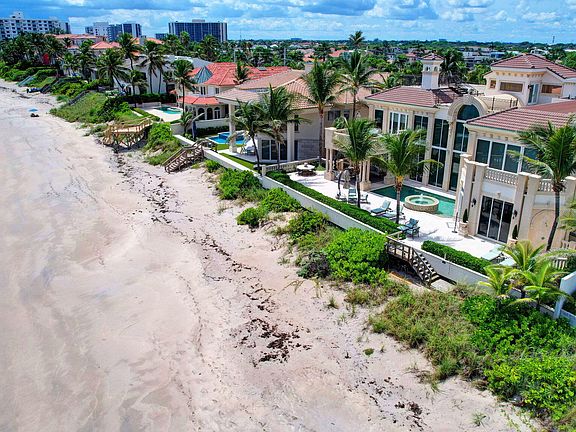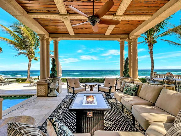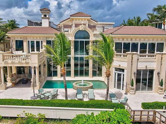 Located in the small idealistic Palm Beach, FL coastal Town of Highland Beach.Walk just 15 feet out your back door to your own 11,000 square foot private beach and gorgeous red reef at this breathtaking Estate that boasts 6 bedrooms, 6 full bathrooms, 2 half baths, elevator, 3 kitchens (gourmet, second, and summer) for fabulous entertaining, a world class gym area, a 12- car drive through air-conditioned garage and car showroom, 2 separate ground floor suites with exterior ingress and egress, oceanside saltwater pool and spa with a swim up bar, cabana room with private outside saltwater spa, large poolside covered loggia, roof top terraces for private sunbathing, alfresco dining and unobstructed views of sunrises and sunsets, large drive through front motor court with double monitored security gates & over 12,200 square feet of air-conditioned living space all resting behind a 17-feet above sea level engineered ocean seawall!