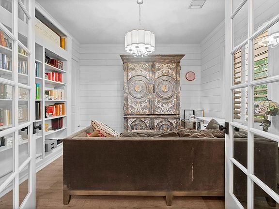 Custom bookshelvesCustom estateCalcutta quartz countertopsWhite ceramic farmhouse sinkGorgeous chandeliersFrench stone tileShip lap walls