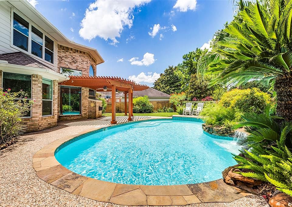 NEVER FLOODED GORGEOUS REMODELED 4 BED, 3/1 BATH, 2 CAR GARAGE VILLAGE BUILT HOME features a tropical backyard, re plastered swimming pool with waterfalls. This home has lots of natural light & has just been repainted throughout in a pale gray with white trim. 2 story living room has built-ins & is open to the large island kitchen with white, recently painted cabinets, SS appliances - double convection ovens, new sink, faucet & dishwasher, under cabinet lighting, quartz counters & large pantry. Wonderful large primary suite w/separate sitting area, fabulous new bathroom - quartz counter, seamless glass doors & 2 large closets. Huge utility with sink & room for 2nd fridge. Engineered hardwood floors & plantation shutters thru-out the foyer, study, dining & living room. New carpet in the bedrooms & game room. Tankless water heater. Car port for 2 cars. Roof 2018, AC 2013. Excellent local Schools. Home is meticulously clean & well maintained