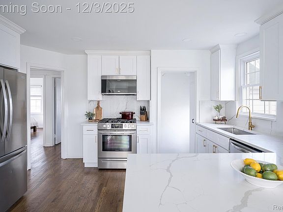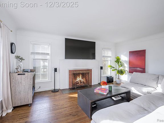 Updated, stylish brick bungalow combines classic charm with polished, modern upgrades. Approximately 1500 sq ft of living space, incredible natural light throughout, living room with a natural fireplace, outstanding '23 Quartz kitchen with stainless steel appliances, and a waterfall peninsula with seating that adjoins the dining room with a bay window. Two generous bedrooms on the entry level and a newer full bath with ceramic tile floors, marble vanity, and subway tile shower. Spacious primary suite includes a wall of closets and '23 bath with an architectural sliding door. Additional updates and features include: relaxing covered back porch, fully fenced lot, hardwood floors throughout, coved ceilings, partially finished lower level, newer roof with transferrable warranty, gutters, and Wallside windows with a transferrable warranty. Fantastic location in the highly desirable Beverly Hills section of Royal Oak, minutes from downtown Birmingham, Woodward, parks, shops, and everyday conveniences. BATVAI