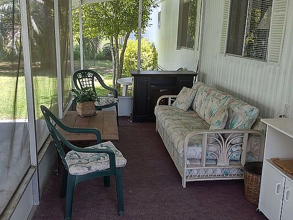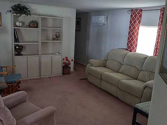 Two bedroom, one bath furnished mobile home on rental lot in small, quiet, well-kept 55+ mobile home community. Has laundry room addition, screen room, carport, small outdoor patio area, shed. Bright kitchen in front, main bedroom is in rear. Mini-split for air conditioning and heat. Spacious lot is approx. 50' x 120', trees, woods, no rear neighbors. The community has a club house for various activities, as well as a shuffle board court. Low lot rent includes water, sewer, trash. Exterior of unit is freshly painted.