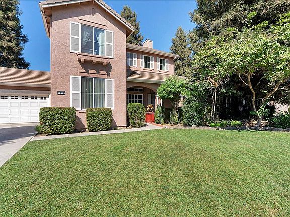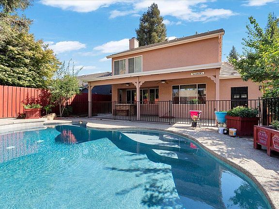 Upstairs you'll find a laundry room with sink and storage, two secondary bedrooms connected by a Jack-and-Jill full bath, and the expansive primary suite. The primary retreat is filled with natural light and features vaulted ceilings, dual sinks, a soaking tub/ shower and a large walk-in closet. Recent updates include a newer AC unit (approx. 3 years old), fresh exterior paint, and newer fencing on the east side. Outdoors, enjoy a backyard built for entertaining with a spacious covered patio, built-in table, fruit and citrus trees, and a sparkling gated pool for both fun and safety. Sellers have loved gathering here with family and friends, now it's ready for its next chapter!