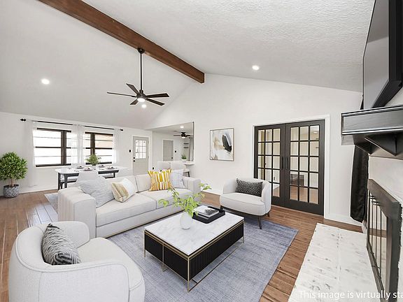 Beautifully updated home with modern finishes and a spacious open-concept design! A full kitchen renovation features custom soft-close cabinets and drawers, new appliances, a refrigerator that conveys, and stunning waterfall quartz countertops that flow into the large living area with vaulted ceilings. Both bathrooms offer matching quartz counters, dual sinks, updated cabinetry, a new guest tub, and a converted walk-in shower with a waterfall shower head in the primary suite. Additional upgrades include PEX plumbing, a serviced roof and HVAC (Sept. 2025), blown-in attic insulation, updated electrical panel with emergency switch, canned lighting, and newly installed gutters. The indoor utility room includes a washer & dryer that will convey. Outside, enjoy a backyard oasis with a covered patio, gas grill, and TV—perfect for gatherings or morning coffee. A detached garage and extra storage complete the property. Located near schools, shopping, parks, and more!