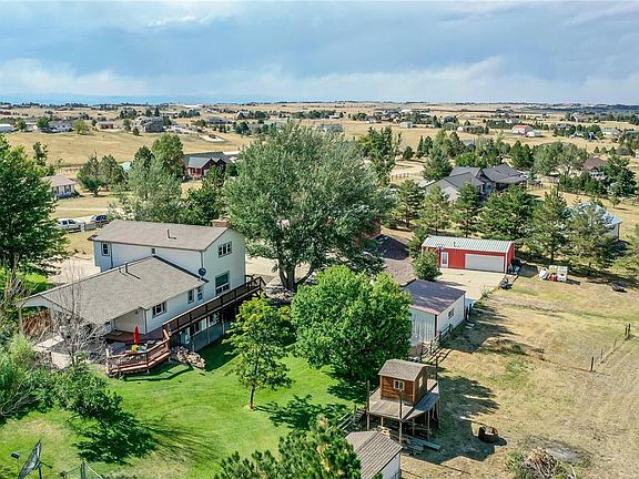 Car and horse lover's dream! This gorgeous home on nearly 4 acres includes 4 outbuildings and garage parking for 10+ cars! The main home has a 2-car attached garage, 4 bedrooms 3 full bathrooms and a half bath, including a bedroom and bathroom in the spacious, finished walkout basement. Well cared for and ready for you to move right in! The cozy living room is accented by a brick fireplace, perfect for cozying-up to on chilly nights. Outside you'll find a large deck to enjoy the open views, and a spacious covered patio below! The first metal frame outbuilding is currently set up as a garage with 11,000 lb capacity lift and room for up to 9 cars, over 1,200sf and heated! The second metal frame outbuilding is set up as an office, with central air and heat, perfect for working from home, it also has a 2-car garage attached! The 3rd outbuilding is a large 1 year old shed perfect for storing all your landscaping equipment/machines. The 4th outbuilding is perfect for a chicken coop or dog house. Outbuildings could easily be converted to barns/loafing sheds for horses and the huge pasture out back is ideal for horses! Front and back yard are spacious and irrigated so there's green grass and room for gardening! The kids playhouse/fort even has electric! Conveniently located near the corner of Singing Hills Rd and Delbert Rd, it's easy to get to Parker Rd and into the Tech Center! Come see this great home and fall in love with all it has to offer!