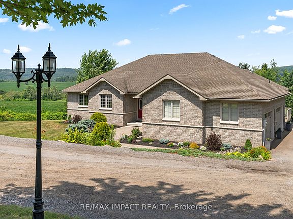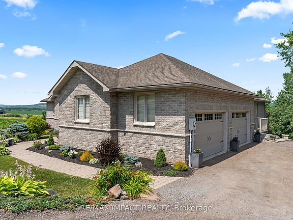 Impressive custom brick/stone bungalow, boasting over 2500 sf of luxurious living space on the main level plus full walkout basement and attached heated 3-car garage with 2 overhead doors. Nestled on an expansive 1.74 acres, this home offers a serene lifestyle with panoramic views overlooking farmlands and the Cavan Hills, complete with a spring-fed pond, ranging from 10-14 ft deep. As you enter the front foyer, there is a convenient den plus the grandeur of a spacious great room, accentuated by a striking stone fireplace and a unique waffle-patterned feature wall. Gleaming hardwood floors flow throughout the home with an abundance of crown mouldings and pot lights. The chef's kitchen is a culinary delight, equipped with stainless steel appliances, a granite countertop, ceramic backsplash, and an island with a veggie sink. The adjacent large dining area opens onto a generous deck, designed with tempered regal glass for unobstructed views of the backyard and fire pit area, ideal for entertaining friends and family. The main floor features 4 well-appointed bedrooms, including a primary suite that includes a walkout to the deck, a luxurious 5-pc ensuite with dual sinks, a separate shower and a whirlpool tub, all complemented by a stylish barn door privacy feature. The primary suite also boasts a walk-in closet with built-in shelving for optimal organization. Two of the additional bedrooms share a convenient Jack and Jill bathroom, while a third bedroom is situated near the 2-pc powder room. The walkout basement includes large above-grade windows that flood the space with natural light, a cozy family room complete with an electric infinity fireplace and a dry bar, 3-pc washroom and a huge open area with extra plumbing rough-ins, perfect for customization. The basement also features ample storage, making it an excellent option for a multi-generational living arrangement with its separate entrances and walkout basement.
