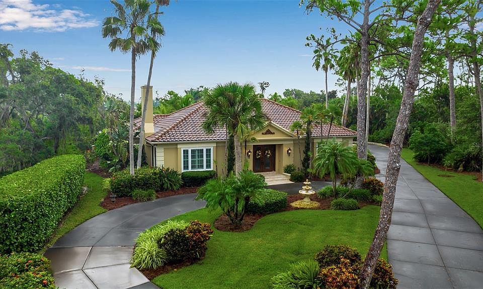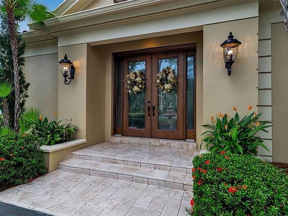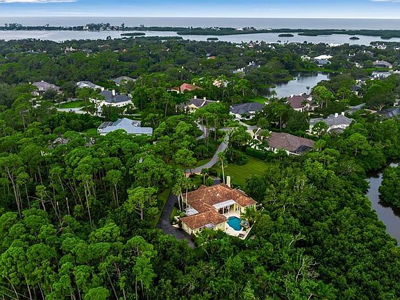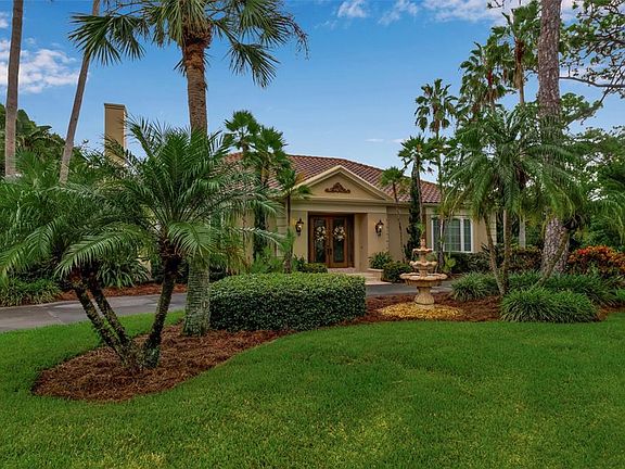 A grand traditional residence, this 3-bedroom, 3.5-bath home is tucked into lush tropical landscaping on a quiet cul-de-sac in The Oaks Bayside. Double entry doors open to a marble foyer and wood floors that set the tone for quality throughout. Just off the entry, a cozy den with fireplace sits opposite a spacious guest suite. The heart of the home is the light-filled great room, with formal living and dining areas opening through French doors to the covered patio and resort-style pool. The kitchen combines beauty and function with granite countertops, center island cooktop, breakfast bar, and a sunny nook overlooking the pool and waterfall feature. The elegant primary suite offers marble floors, soaring ceilings, plantation shutters, and private access to the pool for an early swim or late-night dip. A glamorous dressing area leads to the spa-like bath with soaking tub, walk-in shower, and marble finishes. Two additional oversized en suite bedrooms provide comfort and privacy for guests. A large laundry room with ample cabinetry and an adjacent private sauna complete the interior. Outdoors, the free-form pool with rock outcroppings and waterfall is a showstopper, surrounded by both shaded and open areas for dining and relaxing. With two adjoining lots preserved as gardens, this home offers rare seclusion in a natural setting. Ownership includes membership in The Oaks Club, Sarasota’s premier golf and country club, featuring two championship courses, tennis, WellFit center, fine dining, and a vibrant year-round social calendar—all in the heart of South Sarasota.