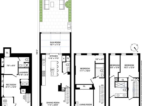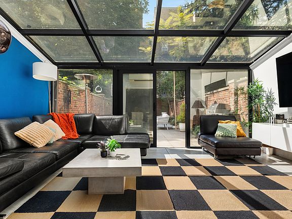 Upon entering the home, you are greeted with a captivating stone facade with a landscaped garden that leads into the first level of the home. Enter through the welcoming foyer and you are greeted by a magnificent great room that seamlessly combines living and dining in one sweeping, light-filled space. Enjoy three oversized windows which allow for ample sunlight in, as well as a working fireplace and central heating and cooling throughout. The gourmet chef's kitchen, which features a breakfast bar, has been meticulously renovated and is equipped with updated appliances including a 6-burner gas cooktop and exhaust fan, full size dishwasher, and a built-in refrigerator-freezer. Additional features include white lacquer cabinetry and an abundance of counterspace throughout to test your culinary expertise. Discreetly tucked away is a powder room with a storage closet and a pantry closet for additional storage. Continue on into the large sunroom which can easily be used as the main living area and into the huge private backyard which is enclosed for privacy and is the perfect place to entertain in the warmer months.