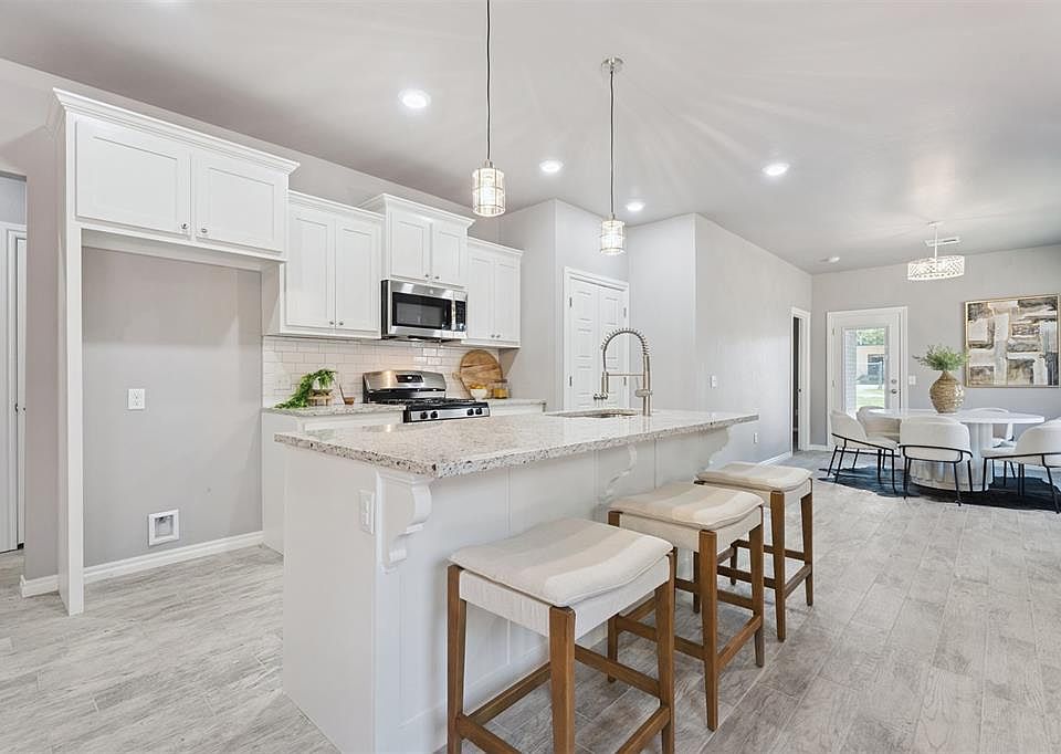 Light, white and bright! Welcome to this charming 3 bed, 2 bath new construction home with a covered front porch welcoming you in. Inside you’ll find an open layout that feels both spacious and cozy. The kitchen offers granite countertops, tiled backsplash, stainless steel appliances, and tons of storage—all open to the living room and a beautiful dining area in the back. The primary bedroom features double sinks, granite countertops, bathtub, a tiled walk-in shower, and a large closet with plenty of space. Don't miss the interior laundry room and a large backyard with a covered porch—perfect for relaxing or entertaining. Ideal location for convenience and lifestyle! Schedule your showing today.
