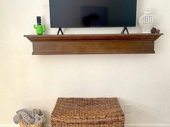 Furnishings: 2 large wall-mounted smart TVs, queen bed and headboard, accent chair, 2 lamps and nightstands, blackout curtains, sofa, desk, office chair, Keurig, microwave, dishwater, cooking/eating utensils, pots & pans, pillows, a set of linens and towels