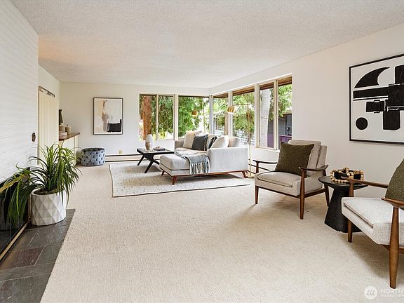 Tucked away on quiet deadend, this meticulously maintained mid-century home offers exceptional privacy & rare street to street access. Expansive, sun-drenched interiors flow seamlessly from room to room, creating a warm & inviting atmosphere. With generous living spaces & timeless design, this home is perfect for relaxing & entertaining. On the main you'll find the living rm w/ cozy fp that flows into lg dining rm, next to eat-in ktchn w/ access to the bbq deck & spacious serene wrap around yard filled w/ mature NW plants. Down the hall, primary w/ en-suite bthrm, 3 add'l bdrms & lg bthrm. Downstairs, huge family rm, 5th bdrm or flex, bthrm, lndry rm, storage & attached garage. Picture windows, new paint & carpet throughout. Welcome home!