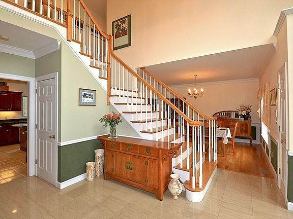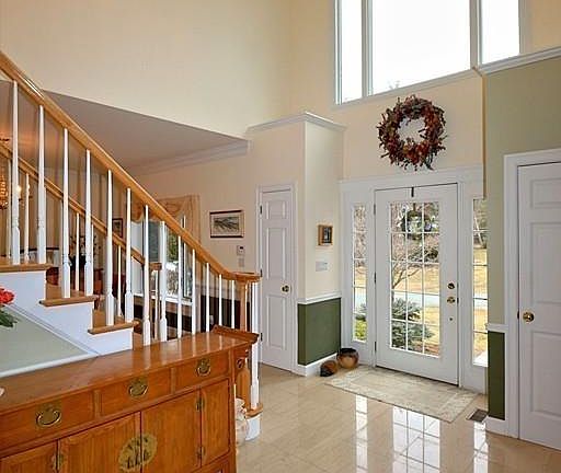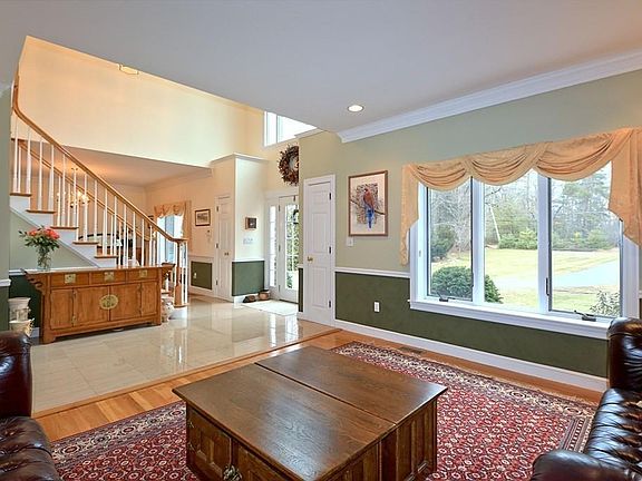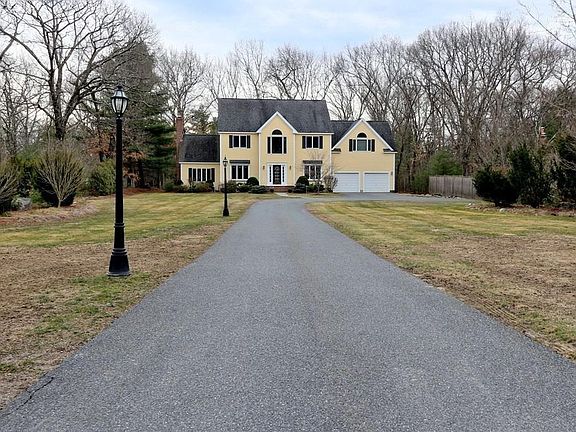 IMPRESSIVE curb appeal! Privately set back over 190' from the road, this young center hall Colonial features a sun-drenched 2-story marble foyer opening to a living room and formal dining room with great flow for entertaining. The well designed eat-in kitchen features custom cherry cabinetry, a center island, granite counters and sliders to an enormous 52' multi-level rear deck. The open floor plan leads to a sunken family room with a stone fireplace flanked by arched windows, vaulted ceiling and French doors to the rear deck. 1st floor laundry and 1/2 bath. The oversized master bedroom includes a sitting area with palladium-style window, two walk-in closets and a large en-suite bathroom with Jacuzzi tub, large stall shower, custom cabinetry with double sinks, granite counters and marble floors. 3 add'l well-sized bedrooms plus full bath. Large level lot w/beautiful exterior plantings and outdoor lighting. Central A/C, 2-car garage. Close to schools, shops, town center. A MUST SEE!