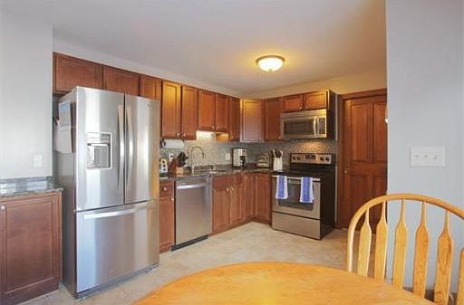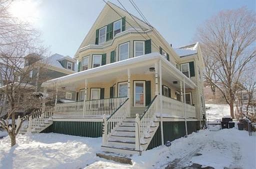 Located in the heart of Melrose, lies this townhouse on 3 living levels. Enter through a mud room with tile floor and cased openings through to the front living room with bay window and period details. The open dining and kitchen were renovated in 2014, which includes custom millwork wainscoting, island with seating for 4 overlooking the patio. The chic and modern kitchen was renovated with walnut stained cabinets, white counters and SS appliances, including a wine fridge. This main floor also features a 1/2 bathroom and laundry. The second level includes three spacious bedrooms with a timeless modern bathroom. The rear bedroom has access to a private roof deck over the yard. The third floor offers flexible use space with two rooms, the current owners use one room as a guest bedroom and the other as a home office with south facing views. The home also features basement storage, central AC and off street parking for 3 cars.