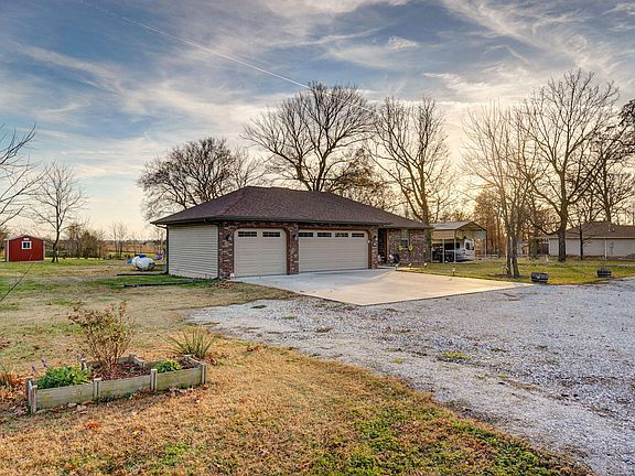 Experience elevated country living at this beautifully crafted ranch nestled on 3 private acres just outside Clever. This thoughtfully built 1,650 sq ft home offers the ideal mix of rustic serenity and modern comfort. As you approach, you'll be struck by the charm of the covered front porch -- an inviting space for morning coffee or quiet evenings, surrounded by acreage and open sky. The exterior blends brick and vinyl siding, giving a classic look that stands the test of time. Step inside to discover a flawlessly designed interior where hardwood, tile, and plush carpeting harmonize across the open living spaces. Tray ceilings add elegance, while large windows flood the rooms with natural light and frame peaceful views of your land. A gas fireplace anchors the living area, creating a warm and welcoming gathering spot for family and guests. The kitchen is a delight: rich, solid-wood cabinetry, a clean layout, and a design that balances function and beauty. Whether you're hosting dinner or cooking for everyday, there's space and character to spare. Adjacent is a flexible room that could be a formal dining area, a home office, or a fourth bedroom -- whichever fits your lifestyle best. Three additional bedrooms and two full bathrooms offer plenty of room for rest, work, or creativity. The master suite is comfortably sized, and each bedroom is served by well-designed closets and finishes. The bathrooms provide tile flooring and thoughtful fixtures, making daily routines feel more refined. One of the standout features of this property is the covered back patio -- a perfect spot for grilling, relaxing, or birdwatching, with a view across your serene parcel. With gently rolling terrain and a few mature trees, the land feels spacious yet manageable. The home also includes a RV carport that features 30 AMP power outlets and a 3 car garage offering plenty of storage and space for cars. Don't miss your chance to own this little slice of heaven, call to schedule a showing!