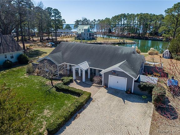 WATERFRONT COASTAL GEM in the highly desirable Mill Creek Harbor neighborhood, home to just 12 quality residences. One of only four properties with its own private dock, this exceptional one-level home offers immediate access to the Piankatank River and Chesapeake Bay. Current owner spared no expense in this remarkable stem-to-stern renovation that includes bamboo flooring, Andersen windows and doors, a new roof, newly designed kitchen and charming decorative tile baths. A welcoming paver entry walk leads to a tile foyer that introduces the home's inviting spaces. The cozy music room/library features exposed beams and custom built-ins, while the spacious family/living room is anchored by an impressive stone fireplace with a stunning mahogany mantle. The sunroom/dining room showcases wide water views with beautiful south/west exposure—ideal for capturing spectacular sunsets. Custom kitchen combines style and function with an expansive island, mahogany dining bar, and granite countertops. A full suite of stainless steel appliances include a state-of-the-art LG refrigerator with dual-door system. With wrap around windows, the primary suite has and serene water views, walk-in closet, and ensuite bath. Two gracious guest rooms share a bath with custom vanity and designer tile for added charm. An expansive deck is perfect for grilling, sunning, or simply relaxing by the water. Composite decking, retractable awning, hot tub with privacy screening, and an outdoor shower create a true retreat. Wonderful level lot offers an easy walk to your private dock with bulkhead for seamless waterfront access. No flood zone and county water. Mill Creek Harbor is a fantastic walking neighborhood featuring a private sand beach along the shores of the Piankatank. The River awaits! Call today.