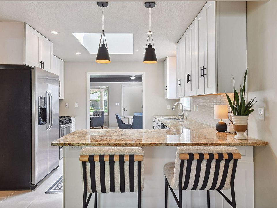 This fantastic home features TWO main floor family rooms, and has an open floor concept ideal for entertaining. Great primary suite with private 3/4 bathroom. Move in ready with newer furnace and AC, roof, windows, updated bathrooms, flooring, and lighting. Lots of natural light throughout. Oversized garage is listed as a 1-car but is over 30’ long, almost a tandem 2-car. Walk out to the spacious and private deck with fully fenced backyard. Easy access to Hwy 169, parks and trails. This home is much bigger than it looks from the outside, and has a spectacular, unique layout. Lots of great space to enjoy and call home!