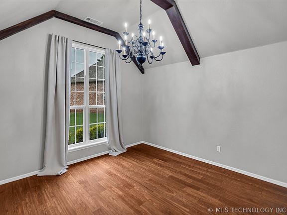 *New Roof April 2024! This beautifully updated 4-Bedroom, 2-Bathroom home located in Jenks Schools. As you enter, the vaulted entryway creates a grand first impression and leads to a thoughtfully designed split floor plan with 4 Bedrooms on the main floor and a Game Room upstairs. The Flex Room offers even more functionality which can be used as an Office or Formal Dining, featuring charming wood beams. The Living Room is light and bright and features a cozy brick fireplace and crown molding. The Kitchen is a chef's dream with granite countertops and Kitchen Aid appliances, making it the perfect space for entertaining guests. Step into the tranquil Primary Suite, where you'll find an updated shower and walk-in closet. The Game Room upstairs is the perfect space for both work and play. You'll love the convenience of the built-in desks, which make it easy to switch between activities and keep everything organized. Whether you need a quiet spot for studying or for family fun, this home has got you covered. The backyard features a covered patio and a pergola, which is ideal for suspending hammocks. The neighborhood offers a park and a stocked fishing pond. This exquisite single-owner home combines elegance and practicality. Schedule your showing today! *SB