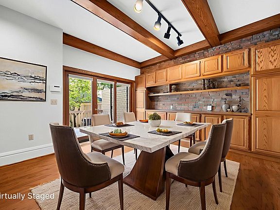 The inviting 1st floor offers a bright open living/dining area with 9-ft ceilings, cozy fireplace, half bath, laundry, and abundant natural light. The oversized kitchen boasts oak cabinetry, exposed brick, beamed ceiling, and a 3-panel atrium door to a private deck and garden.
