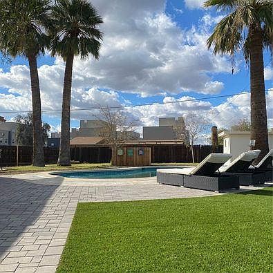 The centerpiece of the backyard is a sparkling pool, inviting you to cool off under the Arizona sun or enjoy a peaceful evening swim. Surrounding it, multiple outdoor seating areas create the ultimate gathering space complete with a mounted TV for game days, movie nights, or casual lounging, and a putting green.
