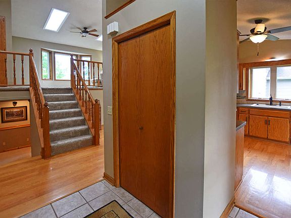 Welcome to this well maintained, move-in ready home. Three bedrooms, 3 baths, 2 car oversized garage. Great location -- close to parks, other recreation, shops and restaurants in both Apple Valley and Rosemount. New ISD 196 elementary school being built nearby. Nice curb appeal with new stamped concrete patio in front of porch. Landscaping adds beauty and privacy. Spacious foyer, with sidelight on the front door for natural light. Turn left to the laundry/mudroom and a convenient half bath. To the right is the kitchen and informal dining area. Nice open floor plan, with a 4 level front-to-back split. Plenty of natural light throughout the home! The living room has two skylights plus a large bay window (ceiling fan, too), and overlooks the formal dining room. A vaulted ceiling adds to the bright, airy feel of the home. The formal dining room, kitchen, informal dining and foyer have hardwood floors. Sliding glass door in the dining room leads to the wrap-around deck. Spacious kitchen includes an informal dining area, situated by a bay window. Pretty ribbon grids on the window. Brand new Anderson windows throughout the home! Two of the bedrooms are on the upper level, including the master bedroom. The master has a large walk-in closet, plus a door to the Jack-and-Jill full bathroom. The baths have all recently been updated, including knock-down ceilings. Walk down to the 3rd level family room. Note the gorgeous tongue-and-groove birch ceiling. Other features include recessed lighting, garden-level windows, and a floor-to-ceiling wood burning brick fireplace with raised hearth and custom mantle. This level also has the 3rd bedroom, and a spacious 3/4 bathroom with slate tile floor. The bedroom has a nice surprise ... a huge dressing area! There is a 4th level, which houses the utilities and lots of storage space. This home has a new water heater, plus the water softener has been reconditioned. Large trees on the lot offer privacy. The huge deck wraps from the side to the back, plus there is a landscaped firepit in the backyard. The oversized garage has a new driveway apron and sidewalk. The garage is sheet-rocked and insulated, plus is a drive-through garage, with a concrete pad in back! Perfect for storing "toys"! Very convenient to shopping and restaurants in both Apple Valley and Rosemount, including Target and Hy-Vee. Easy access to Co. Rd. 42, Co. Rd. 46, Hwy. 3, and Hwy. 55. Directions Diamond Path south to 155 East to home on Right.