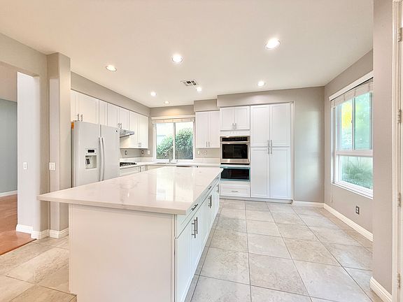 Center islandPrivate gardenHigh ceilingsNew appliancesCorian countertopsWhite shaker style cabinetsBeautiful kitchen