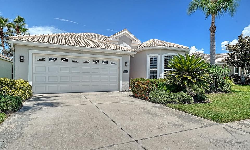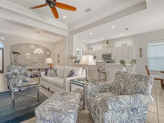 Set in the heart of the tranquil Villa Rosa community, this meticulously maintained villa is strategically located for your utmost convenience. The open layout features a spacious living area with impressive 10-foot tray ceilings, bathed in natural light and painted in soft, neutral tones that create a warm atmosphere. The galley-style kitchen is a testament to practicality and comfort, boasting wooden cabinetry, stainless steel appliances, and a cozy eat-in nook that is perfect for informal dining and enjoying your morning coffee. For added convenience, a coffee and drink bar, as well as a laundry room, are located just off the kitchen. The thoughtfully designed split-floor plan ensures privacy throughout the home. At the front, two bedrooms and a full bathroom provide ample space, while the expansive owner's suite at the rear serves as a serene retreat, offering tranquil lake views and a spacious walk-in closet. The en-suite bathroom includes double vanities, a soaking tub, a separate glass-enclosed shower, and a private water closet. The screened lanai provides an ideal spot to relax and take in the peaceful surroundings, along with breathtaking water views. Living in Villa Rosa means enjoying maintenance-free living in a gated community of just 177 homes. Residents benefit from a pet-friendly environment that encourages neighbors to connect while walking their dogs. Community amenities include a heated pool, a spa, a clubhouse, and a fitness center. Nearby, Urfer Family Park offers nature trails, playgrounds, and picnic areas. This villa beautifully combines comfort, style, and a strong sense of community.
