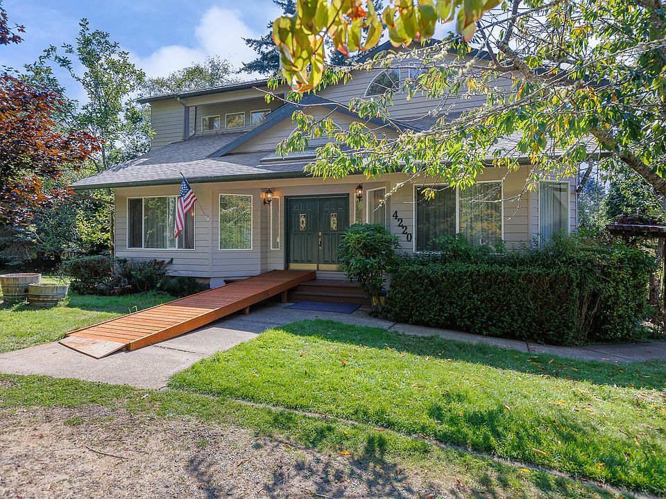 Welcome to a light-filled home surrounded by mature landscaping, garden beds, and fruit trees in a peaceful wooded setting. Enter through elegant French doors into a bright and open space featuring skylights and vaulted ceilings with exposed natural beams, adding warmth and character throughout. The formal dining room boasts floor-to-ceiling windows, offering a spectacular view and an ideal space for entertaining. The kitchen is beautifully appointed with granite countertops, a generous pantry, and convenient access to the adjacent laundry room. The master bedroom is a true retreat, featuring a wall of windows that invites the outdoors in and floods the room with natural light. Outdoor living with large decks on every level, including a covered deck perfect for year-round BBQ.