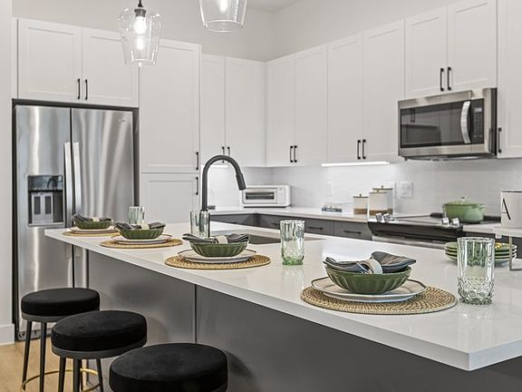 - Exterior features: Barbecue, Bicycle storage, Conference Room, Courtyard, Curated, monthly resident events, Designer fixtures, Dual vanity sinks in select apartments, Easy access to Hwy 121, Electric vehicle chargers, Framed bathroom mirrors, Free Weights, High-speed Internet Ready, Keyless entry, Linen closets in select apartments, Package Receiving, Pet Park, Pet wash & grooming station, Plush carpeting in bedrooms, Quartz countertops in kitchens and baths, Side-by-side refrigerators, Stainless steel appliances, Two-tone upper and lower cabinets, USB outlets