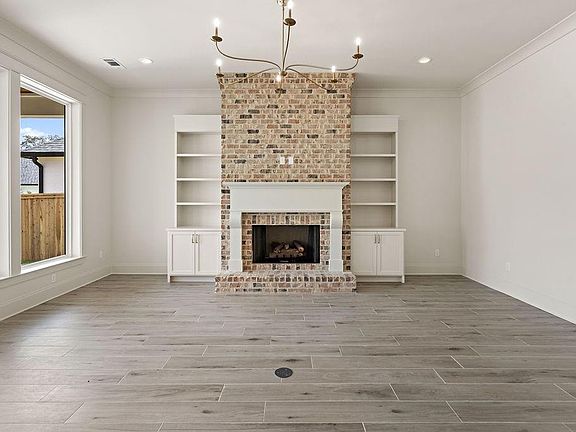 The living room showcases a wall of windows overlooking the backyard, anchored by a brick fireplace with custom built-ins. The kitchen is a chef’s dream, featuring a massive island with Macaubas Fantasy quartzite, floor-to-ceiling custom cabinetry, stainless steel appliances, gas range with pot filler, custom hood vent, and a beautiful tiled backsplash. A spacious butler’s pantry adds additional storage and prep space.