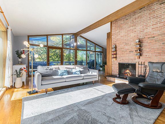 Discover mid-century charm and modern comfort in this inviting ranch tucked along a quiet private drive in the desirable Cascade area. Surrounded by mature trees and backing to a wooded ravine, this home offers privacy while being just minutes from shopping, dining, and major roads in Forest Hills Schools. Inside, vaulted ceilings, a wall of windows, and a cozy brick fireplace create a warm, open living space. The kitchen blends style and function with modern appliances and tile finishes that complement the home's timeless character. Three main-floor bedrooms include a spacious primary with direct bath access. The three-season sunroom overlooks the woods, perfect for morning coffee or relaxing afternoons. The finished lower level adds a large recreation room, hobby space, and workshop. A spacious deck and fire pit patio complete this special Cascade retreat.