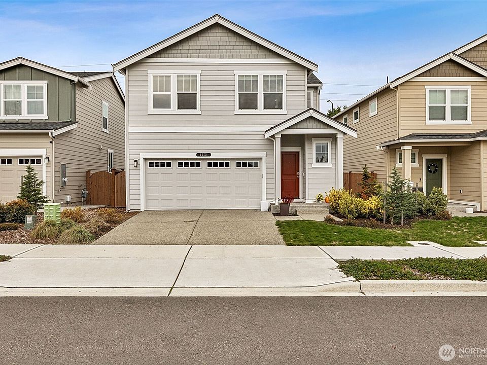 Welcome to Bradley Park! This nearly-brand-new  Sherwood plan is filled with natural light & thoughtful design, offering all the modern comforts of a new home. Open-concept layout seamlessly connects the kitchen, dining, & living areas—perfect for entertaining. Chef-inspired kitchen features a quartz island, gas range, undermount sink, & abundant cabinet space. Upstairs, the spacious primary suite includes a private bath w/ dual sinks & a walk-in closet. Three additional bedrooms, full bath, & convenient laundry room complete the second floor. Enjoy a fully landscaped, fenced yard, A/C, & smart home features + neighborhood playground & dog park across the street—all just minutes from JBLM, I-5, Costco, & more! Builder Warranty Transfers!