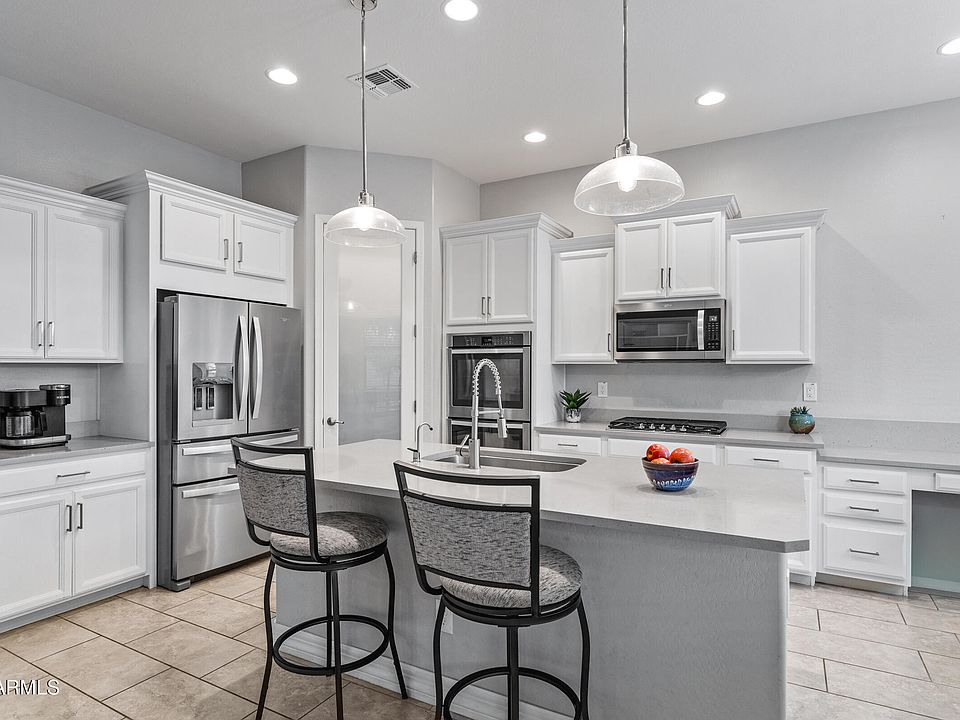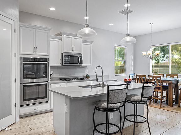 Gorgeous kitchen with designer cabinetry, beautiful quartz countertops and stainless steel appliances with a gas cooktop and double ovens. Spacious kitchen island with pull out drawers and a walk in pantry offer wonderful storage in your gourmet kitchen. Great room floor plan with 10' ceilings and a multi-sliding glass door out to your backyard oasis. Spacious covered patio with an extended paver patio wonderful for entertaining. The backyard is completely fenced offering wonderful privacy. The owner's suite includes plush carpet with a spacious bathroom including dual vanities and a big walk in shower. You also have ample space with a walk in closet. Split floor plan offers great privacy to your guests. The den includes double 8' tall doors perfect for that craft room, home office or 3rd bedroom. The oversized laundry room includes built in cabinets with the washer and dryer included. The garage offers plenty of storage as well with additional space perfect for a workshop or to park that new golf cart. This energy efficient home includes spray foam insulation and dual pane low E windows. If you are looking for the perfect home that checks all the boxes this one is it.