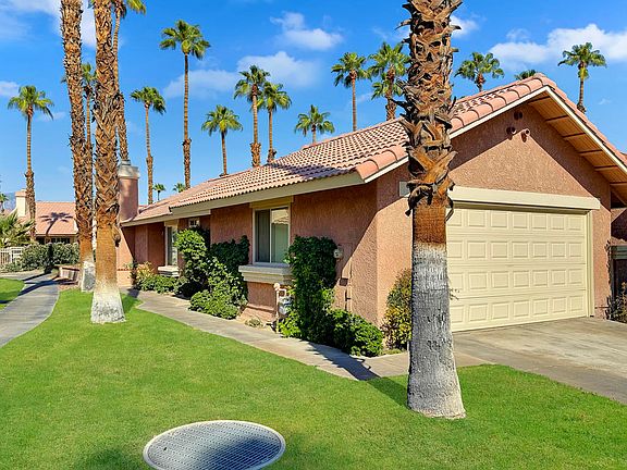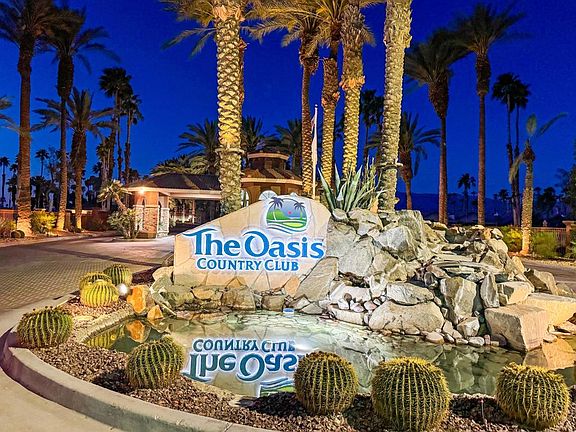 Spacious Oasis Country Club Home with wrap-around patio. Welcome to this light-filled single-level home in the sought-after Oasis Country Club! This rare property is attached on only one side, giving it a true sense of privacy. The massive living room is the heart of the home, featuring vaulted ceilings, a cozy fireplace, and an open-concept layout that seamlessly connects the dining area, breakfast bar, and kitchen. The kitchen is bright and airy with abundant counter space and cabinetry, perfect for cooking and entertaining. Offering three bedrooms (or two bedrooms plus a den/office), the flexible floor plan works for many lifestyles. The primary suite includes a private patio, en-suite bathroom, and generous closet space. The secondary bedroom boasts vaulted ceilings and direct access to the hall bath, while the third room is ideal as a guest space, office, or hobby room.Enjoy desert living at its finest on the expansive wrap-around covered patio, perfect for year-round outdoor dining, BBQs, and gatherings. A greenbelt and mature lemon tree sit just beyond your patio, providing a peaceful view. Additional highlights include newer dual-pane windows, a recently upgraded air conditioning system, and a newer hot water heater. Ceramic tile flooring runs through most of the home, creating a clean, low-maintenance look.Just steps from your door, you'll find one of the community's sparkling pools and spas. The Oasis Country Club offers a private 18-hole golf course, multiple pools and spas, tennis and pickleball courts, and even a putting course - all within a gated, beautifully landscaped community. Come see why so many love calling Oasis Country Club home!